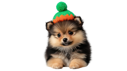 Pomeranian dog PNG, cute Pomeranian wearing a red Santa Claus hat, smiling festive dog for Christmas, isolated Pomeranian with Santa hat for holiday designs