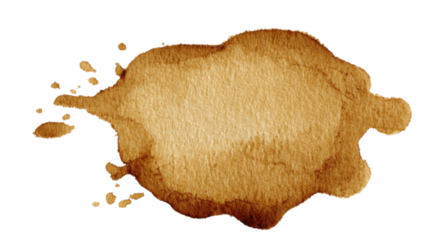 Brown watercolor stain with splashes and splatters forming an irregular coffee blob texture, organic and grungy for backgrounds, overlays, or decorative graphic design use