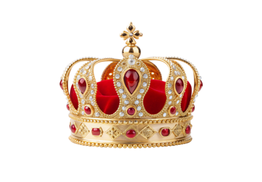 Elaborate ceremonial crown featuring gold filigree, red gems, pearls and decorative cross, isolated on a transparent background