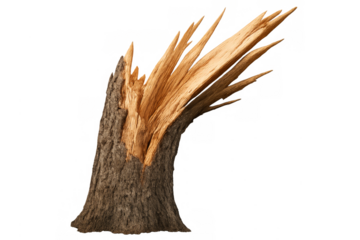 A broken wooden branch with two sections splintered apart isolated dry transparent background