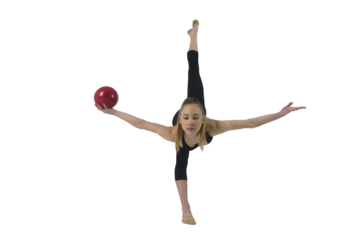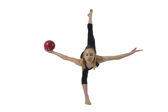 young gymnast in a photo studio shows stretching while doing splits while standing on one leg with a ball,