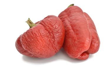 Two bell peppers with wrinkled skin. Damaged by high temperature.
