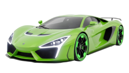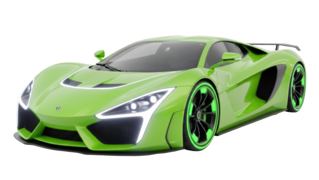 Lime green sports car PNG isolated on transparent background, modern supercar with black rims for automotive design and advertising
