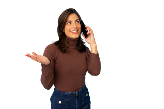 Young woman smiling and gesturing while speaking on a mobile phone, isolated on transparent background