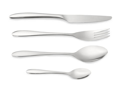 Cutlery set on white. Knife, fork, spoon and tea spoon. Png isolated with transperancy