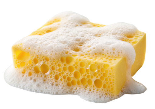 Yellow sponge covered with white foamy suds isolated on a clean white background for cleaning