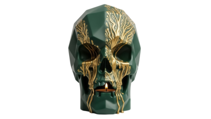Green and gold skull candle holder isolated PNG, decorative Halloween object with burning candle on transparent background
