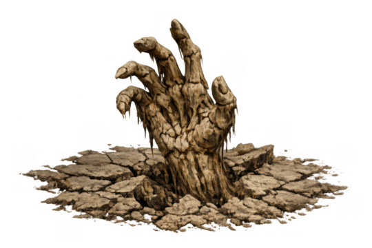 Zombie hand emerging from grave, pale dead skin and bloody wounds, representing horror, undead apocalypse, evil resurrection, and halloween themes on transparent background
