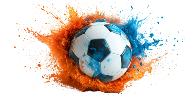 Soccer Splash A Dynamic Soccer Ball Surrounded by Vibrant Orange and Blue Splashes A Sporty Visual