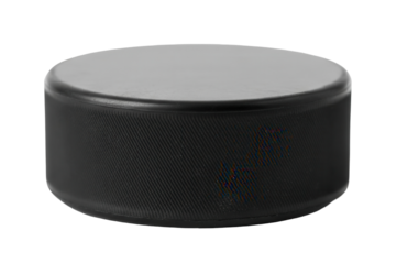 A round, black rubber hockey puck is on a clean white surface. The puck is a sports accessory.