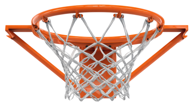 orange basketball hoop with white net hanging on white background