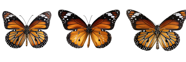 Three monarch butterflies with spread wings against black