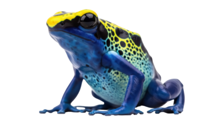 Dyeing poison dart frog isolated PNG, vibrant blue and yellow amphibian with black spots on transparent background, exotic pet