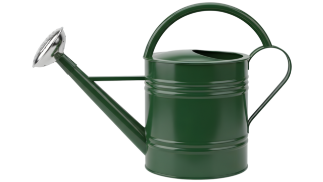 Green metal watering can with long spout and handle isolated on a transparent background garden