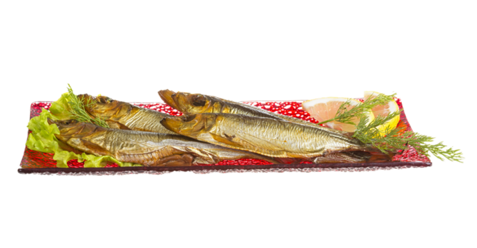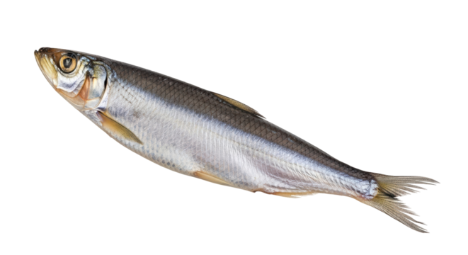 Isolated on transparent background, a smoked baltic sprat with a shiny silver texture, showcasing a traditional european seafood delicacy in a studio shot