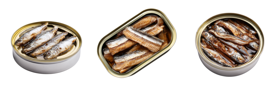 Set of Top-down view of sprats fish in an open tin can showing natural texture and shine on transparent png background. Ai generated