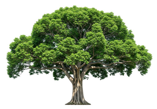 A lush green mature banyan tree with a thick trunk and sprawling branches isolated on transparent background