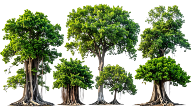 Several lush green trees with thick trunks and sprawling canopies, isolated on white