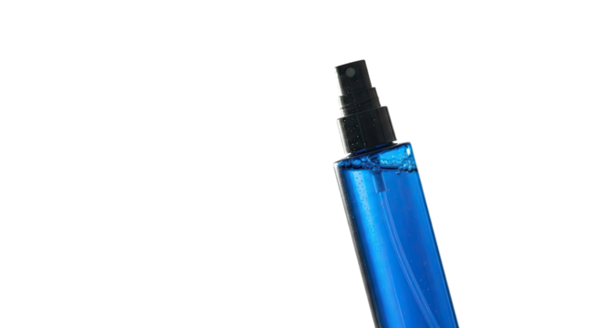 A blue plastic spray bottle isolated on transparent background. Suitable for cleaning products, gardening, or household use.