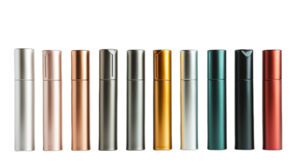 various bottles / roller bottles / spray bottles made of glass and metal for cosmetics, natural medicine , essential oils or other liquids isolated over a transparent background, top view
