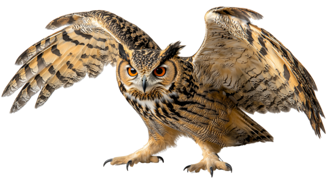 An owl with wings spread out, standing on a white background, looking at the camera, brown feathers, black stripes, orange eyes, ready for flight.