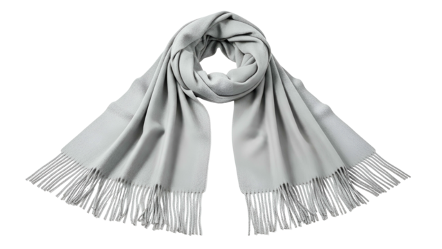 A neutral-toned scarf with fringed edges, spread out against a transparent background