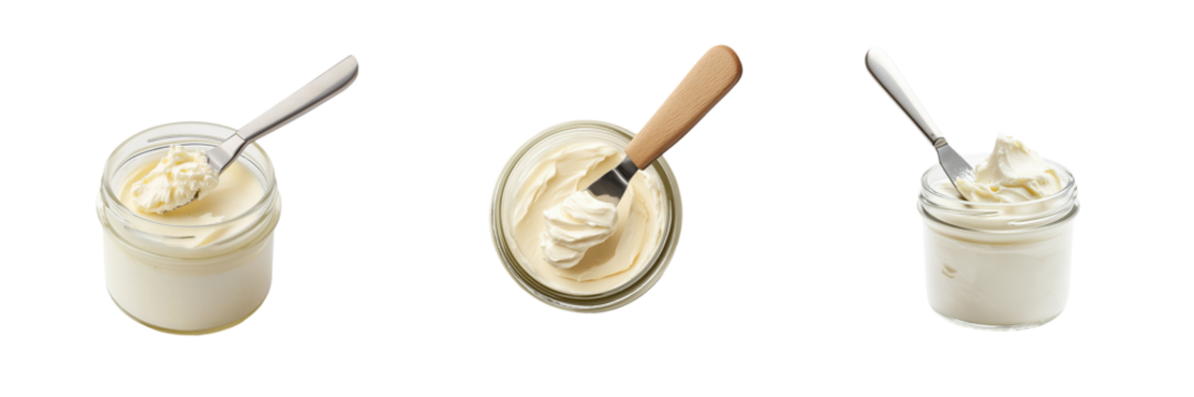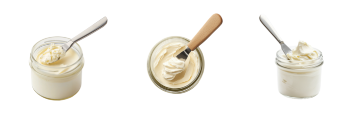 A small glass jar of homemade cream cheese with a spreading knife dipped into its smooth, creamy surface, isolated on a transparent background