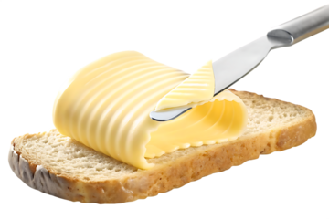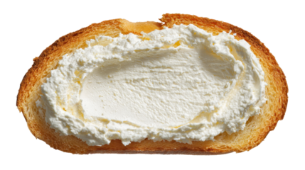 Toasted baguette piece spreading with creamy soft cheese, crafting a simple and fresh breakfast or appetizer snack, isolated on a transparent background for versatile design