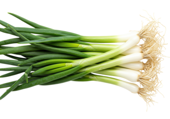 Fresh organic spring onions with vibrant green leaves and white bases, perfectly arranged on a transparent background with copy space, concept of fresh healthy ingredients