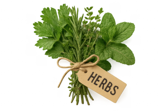 Fresh herb bundle featuring mint, rosemary, thyme, parsley, bound with label against transparent backdrop