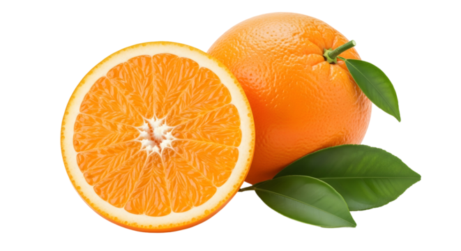 Fresh and juicy orange fruit with green leaves, one cut in half isolated on transparent background