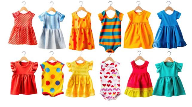 Dresses in Vogue: A captivating array of colorful baby dresses, each delicately suspended on hangers, creating a visual feast of style and fashion.
