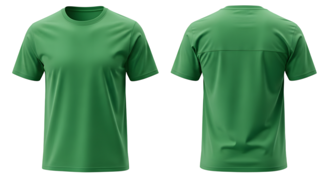 Front and back view of a plain green tshirt, isolated on transparent background, showcasing its simple design and fabric texture, perfect for fashion mockups and ecommerce product displays