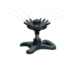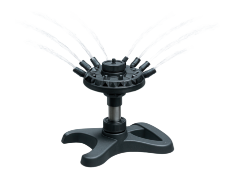 Rotating garden sprinkler with multiple adjustable jets spraying water on transparent background.