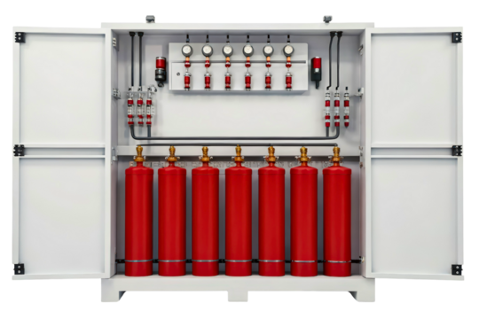 Industrial automatic fire suppression system with red gas cylinders isolated with transparent background