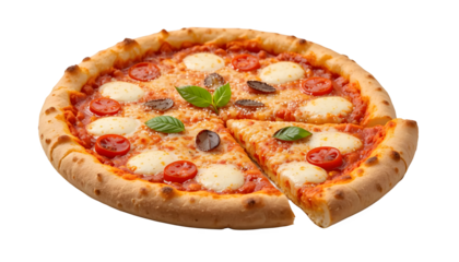 Golden brown baked pastry with sausage and melted cheese topping sprinkle of herbs transparent background