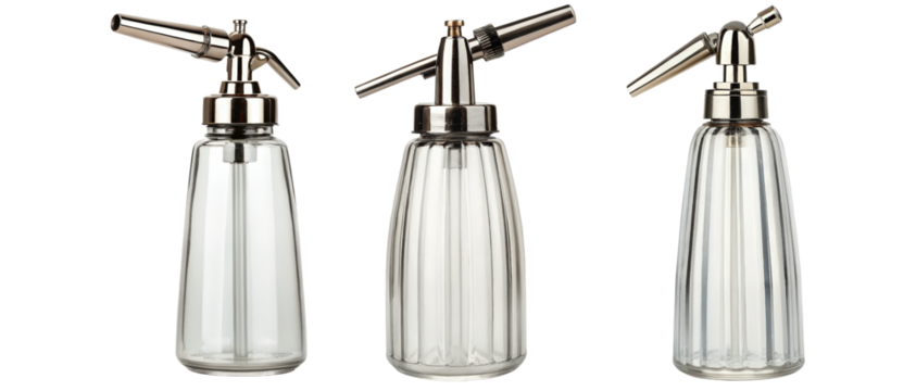 Three glass soda siphon bottles with metal tops on a transparent background