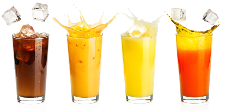 Set of four colorful spritzer cocktails with a splash effect.