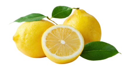 Sliced lemon with whole lemons and green leaves, white isolated background.