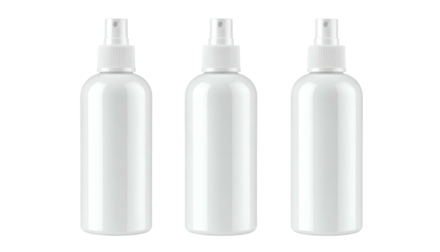 Three identical white spray bottles, slightly angled, against a stark black background
