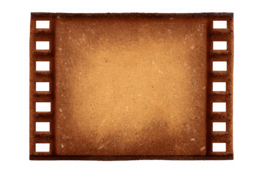 Sepia film strip frame with grunge texture and sprocket holes, vintage empty horizontal cinema motion background, transparent