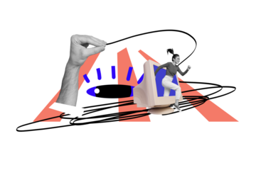 Creative photo poster trend art collage image of hand catch line trap happy girl run pc monitor screen eyeball hacking spyware