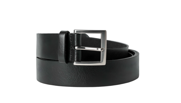 Black Leather Belt with Silver Square Buckle on Transparent Background