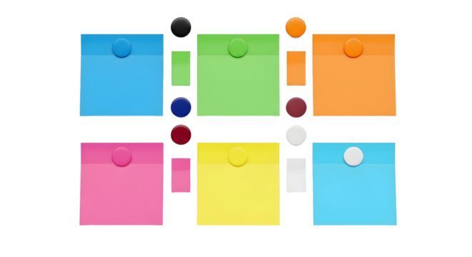 Colorful square sticky notes and push pins on a white background, symbolizing organization and reminders
