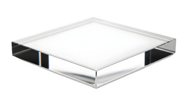 Clear acrylic square block or plexiglass cube display stand isolated on transparent background