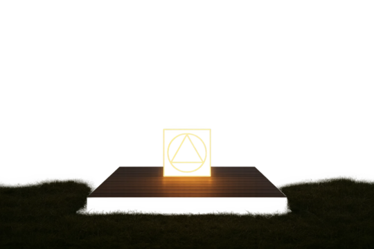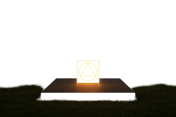Glowing triangle in square magic symbol hovering over platform on grass deck with magic symbol and transparent background