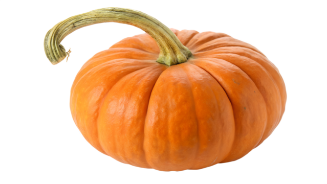 A single ripe orange pumpkin with a green stem, isolated on transparent background