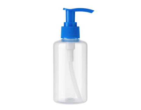 A clear plastic pump bottle with a blue dispenser cap, designed for dispensing liquids like soap, lotion, or sanitizer.