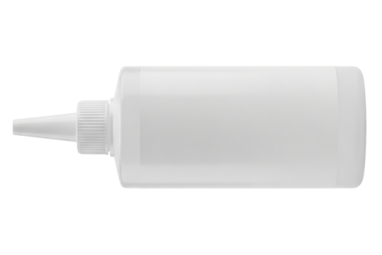White plastic squeeze bottle with applicator tip for liquid glue isolated on a transparent background