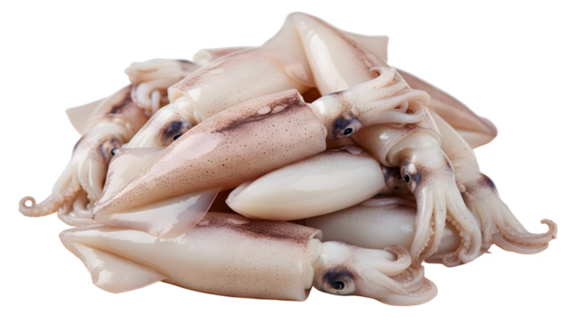 Collection of Raw Baby Squid Isolated on a Transparent Background.